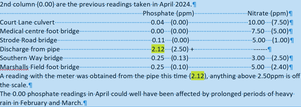 - WATER QUALITY LYF have just received latest phosphate sampling under freedom of information request from the Environment Agency. The results continue to show levels exceeding Water Framework recommendations for a watercourse. A brief comparison was made at the meeting between these latest Environment Agency results and those contained in the dissertation report previously produced as part of a university Masters Degree course. Indications are that phosphates are penetrating further into the town from upstream contamination. Geoff to review more fully and report back on the results.