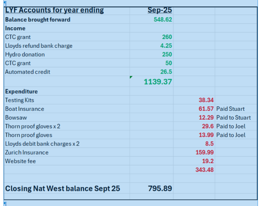 The LYF remains solvent with funds exceeding expenditure and with reserves somewhat larger than normal remaining following donations from Hydro International as a thank you for organising joint World Water Day river clean days with them.. Our application to Clevedon Town Council’s 2025 small grants scheme was successful and welcome as they are the only body that supports revenue as well as capital costs.