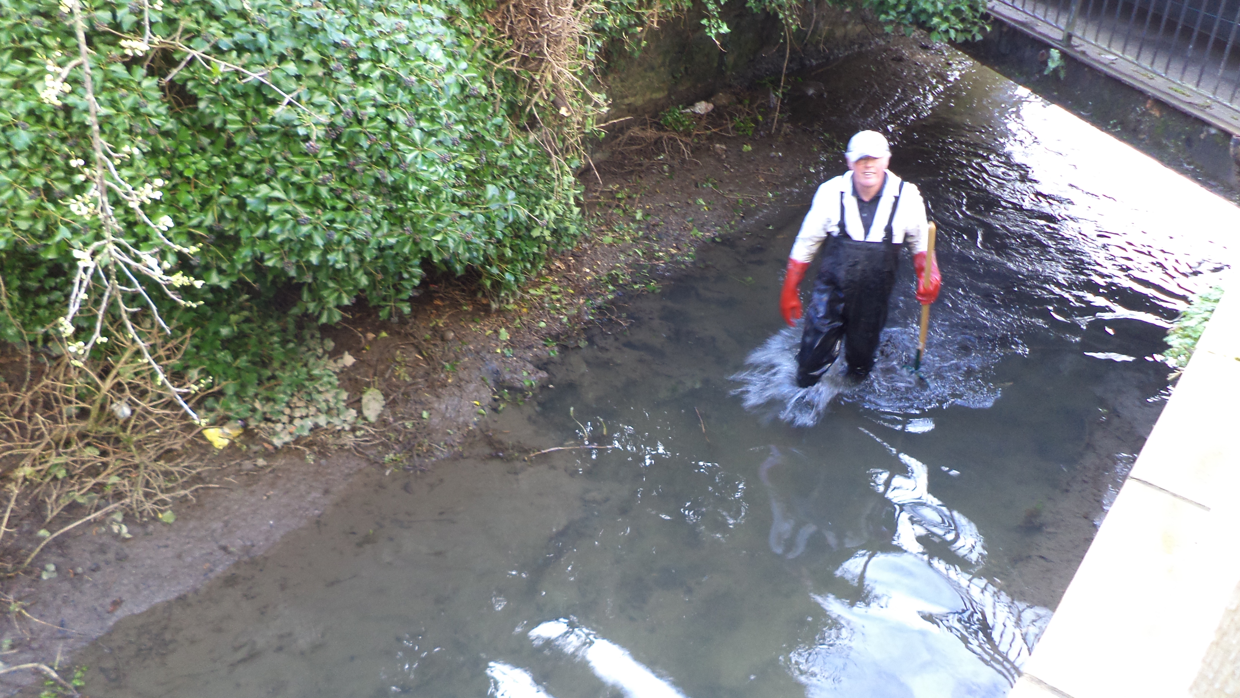 8/1 – Clear weeds and watercress from behind the old corn store – Stewart/Alex/Simon and banks-man Steve, water level higher than normal and raining.